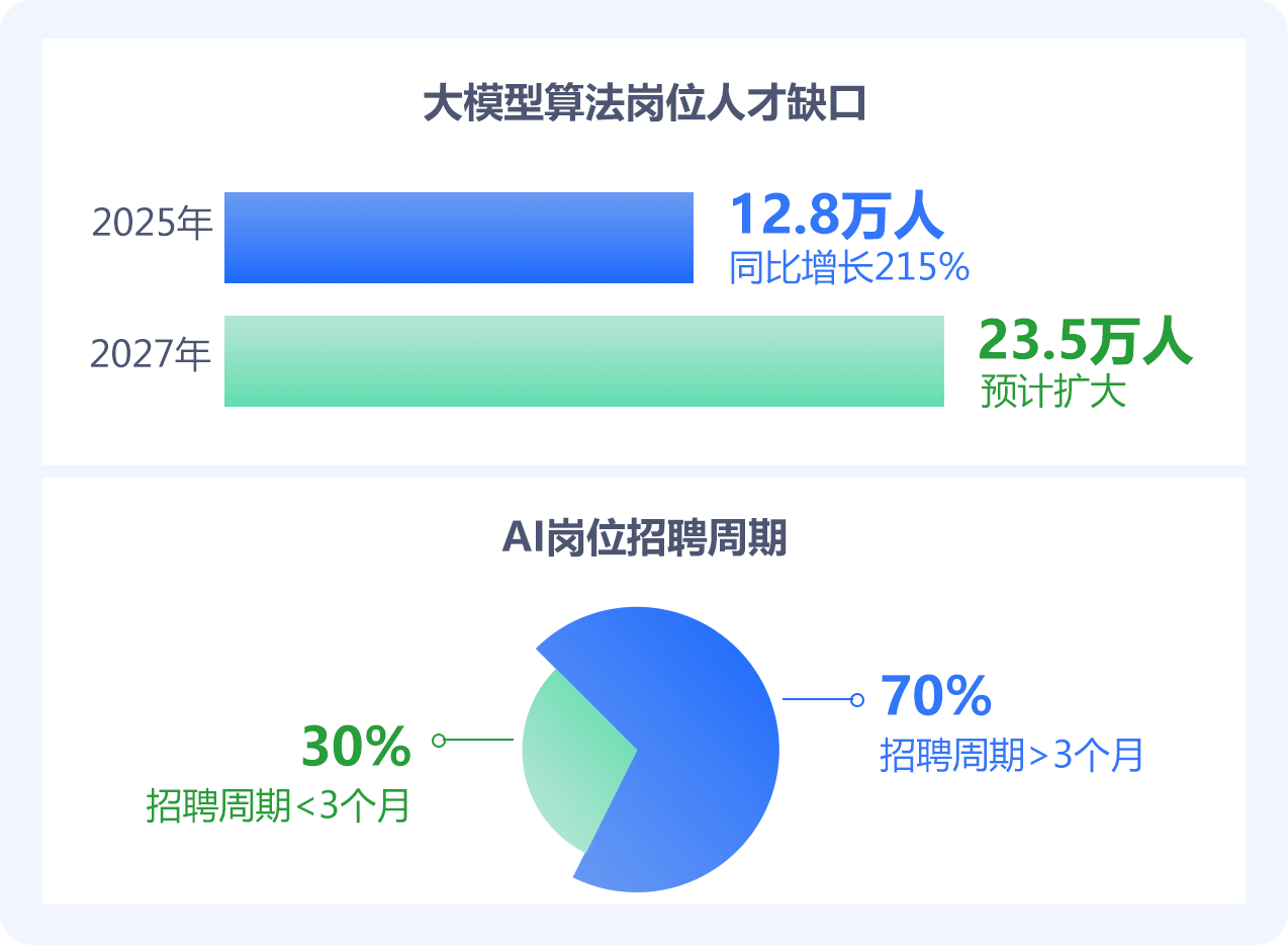 2025年大模型算法岗需求同比增长215%,人才缺口达12.8万人,预计2027年将扩大至23.5万人,70%AI岗位招聘周期超过3个月,企业 "高薪难觅" 现象普遍。